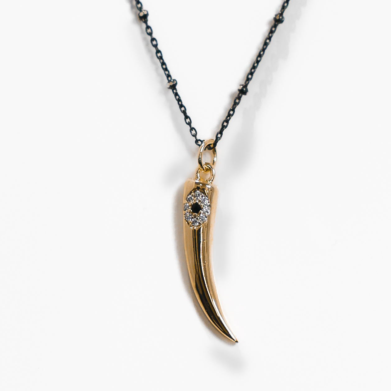 30mm gold plated Eyehorn pendant in a 17" black chain.