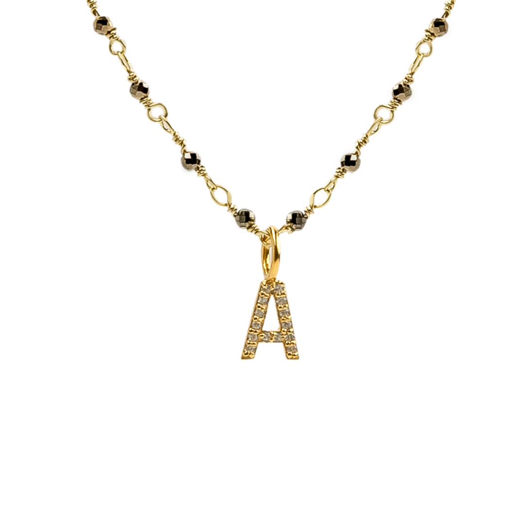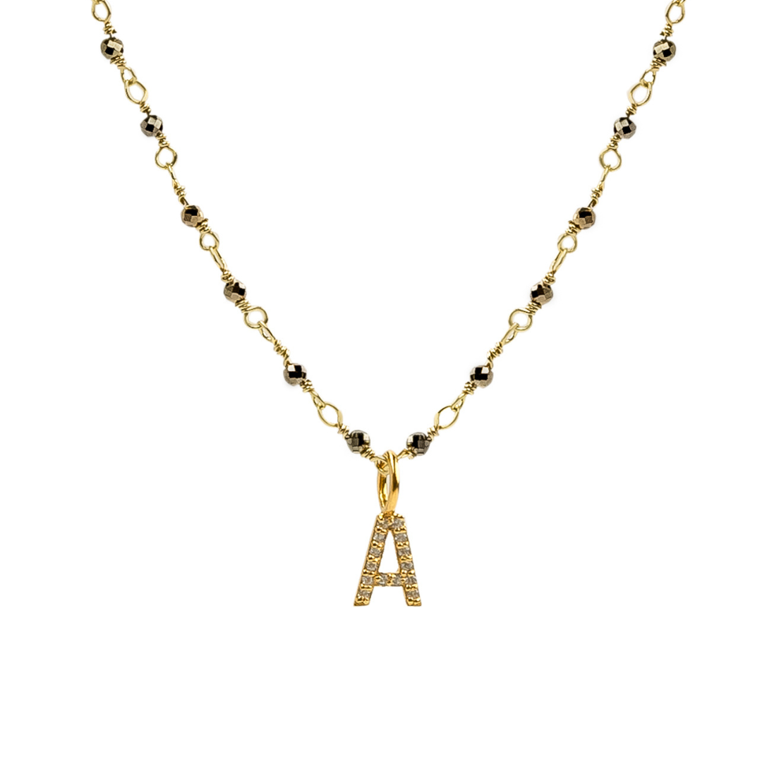 Letter made gold plated brass w/ cubic zirconias in a 16" silver gold plated with pyrite.