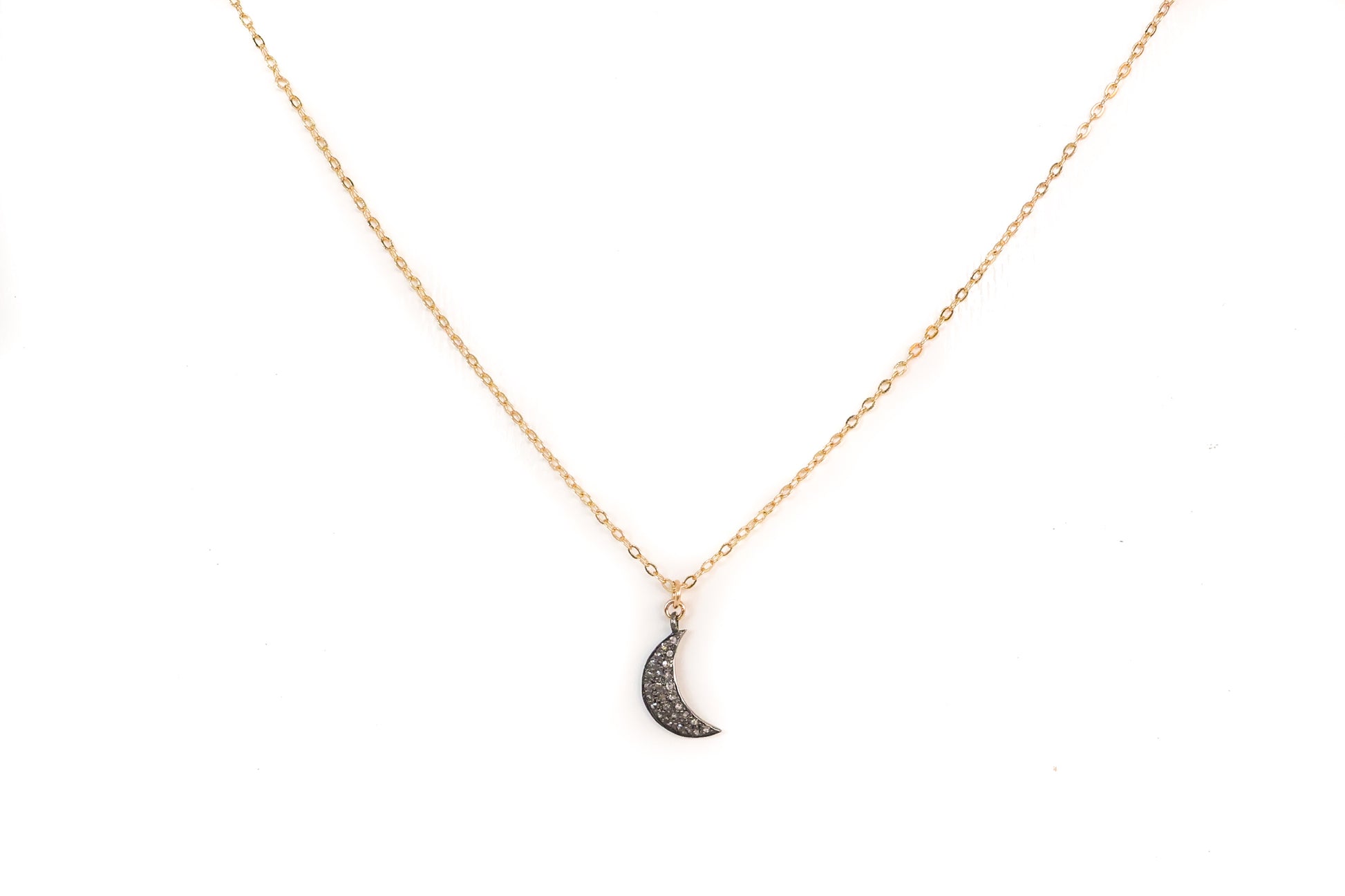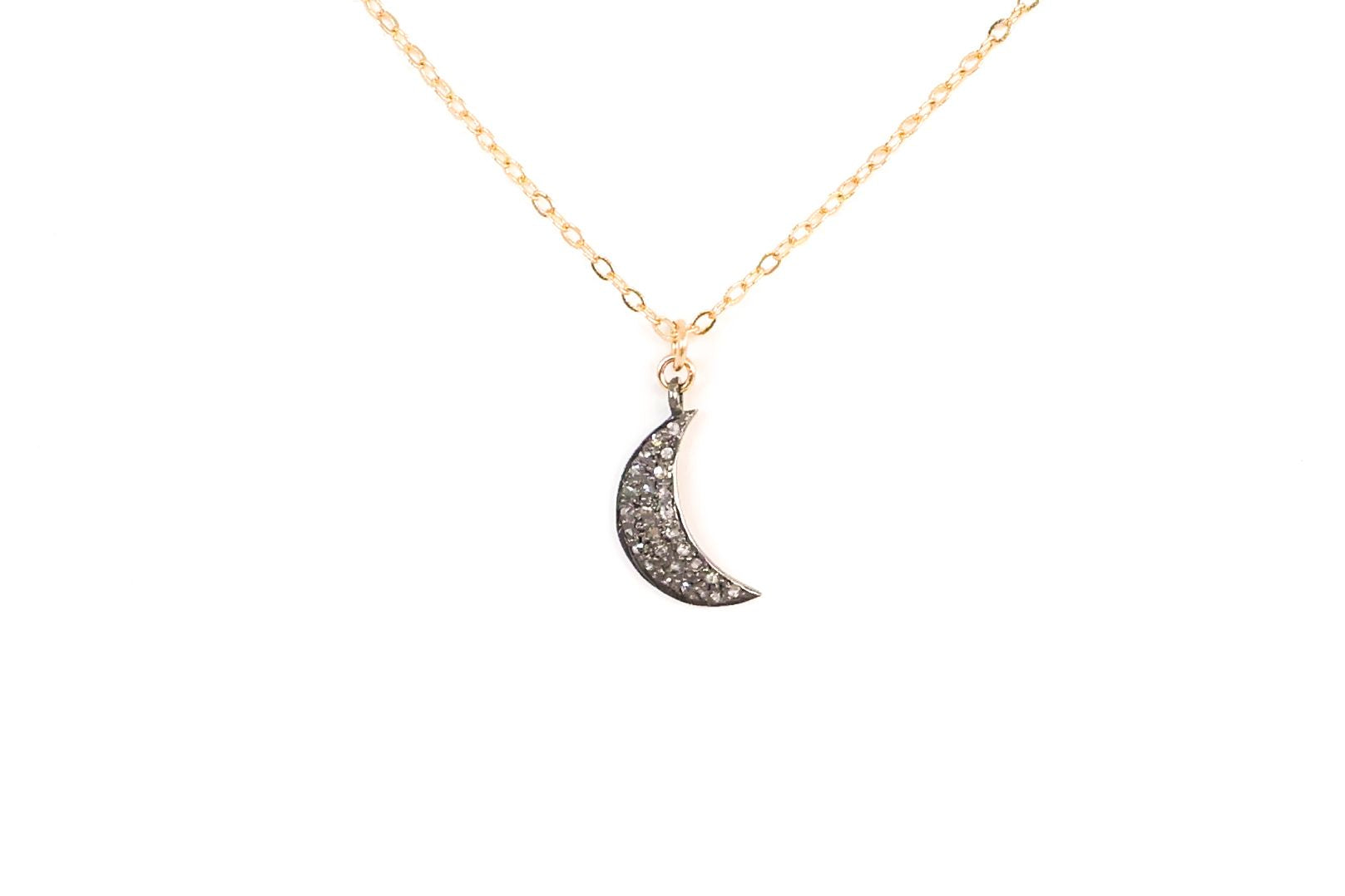 15mm long half moon pendand with pave diamonds in a 16" gold filled chain.