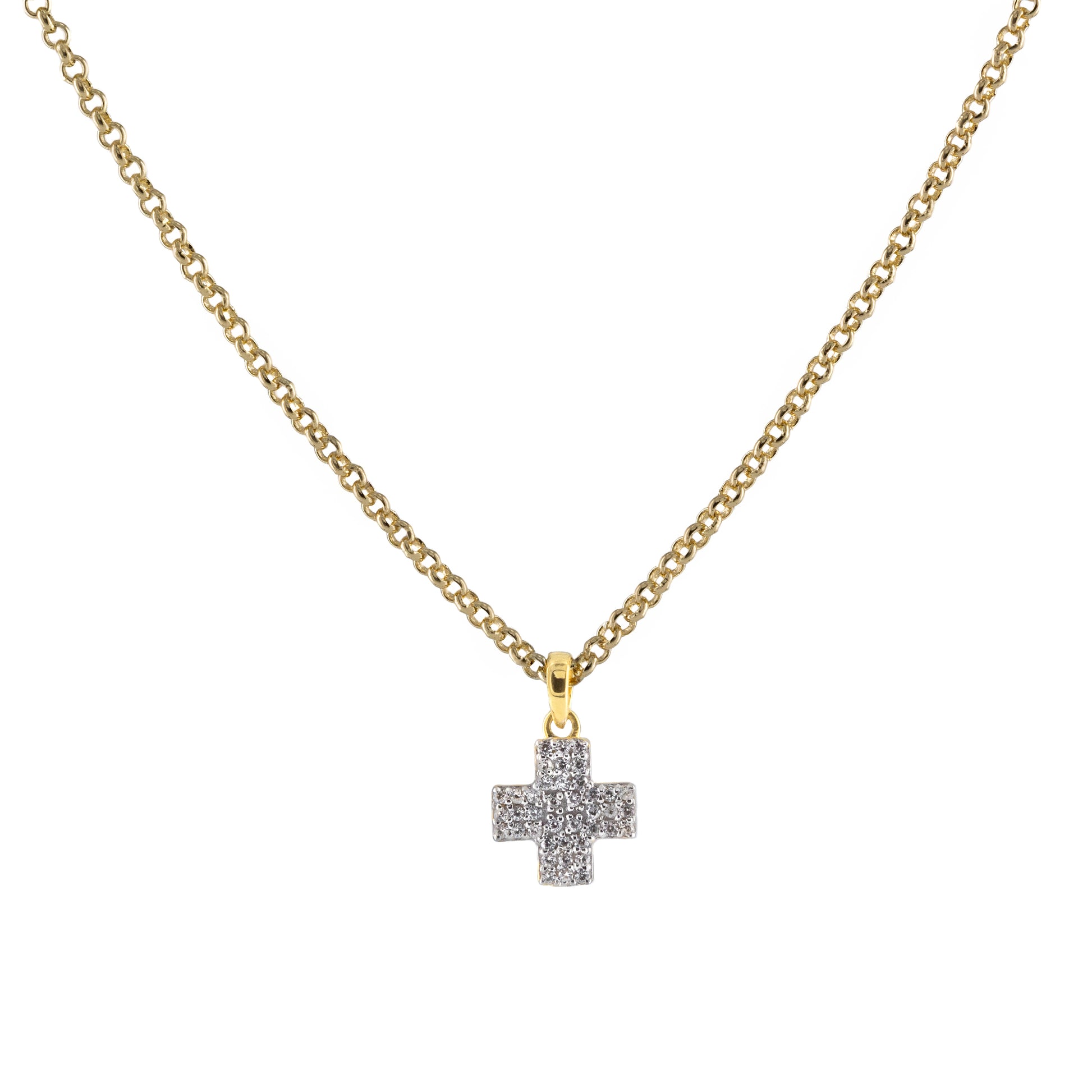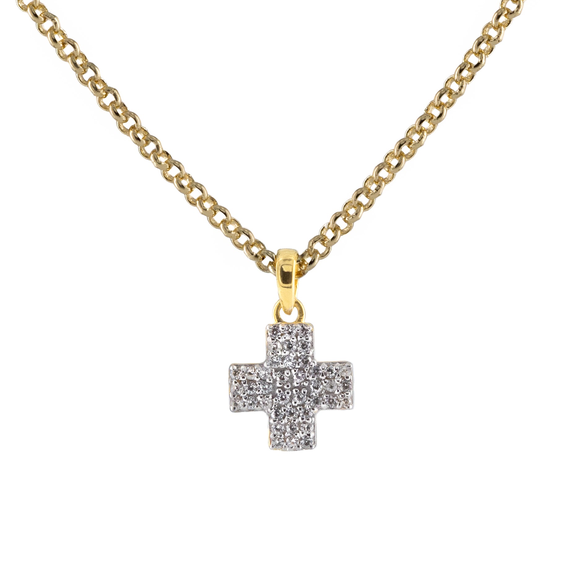 Cubic zirconia and silver gold plated cross in a 16" gold filled chain.
