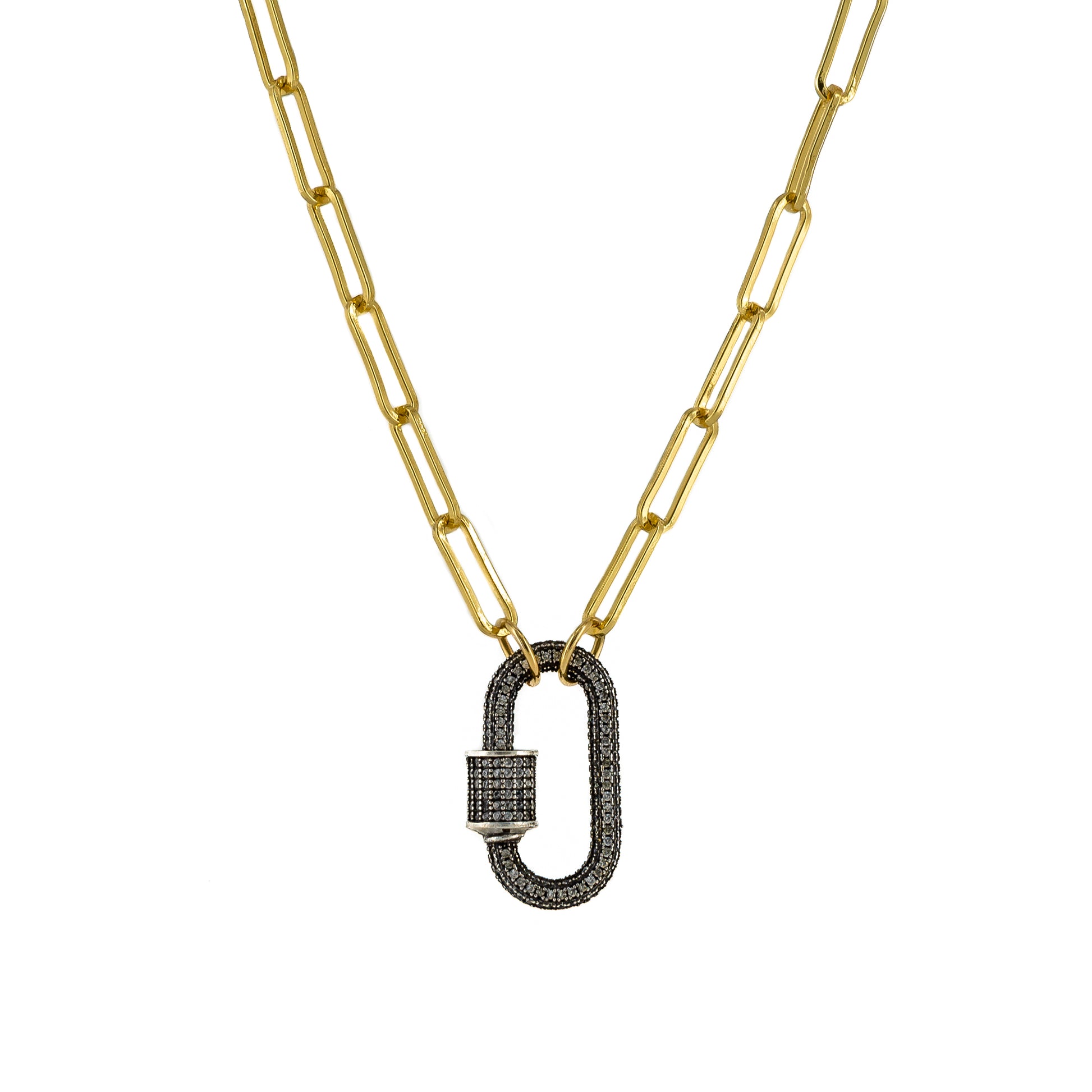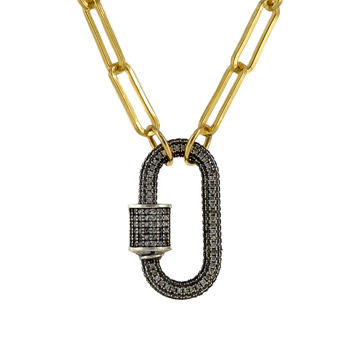 1" Zirconia clasp pendant in a 16" gold filled chain.